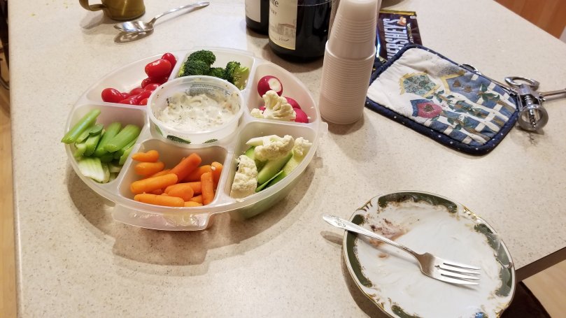 .I am so glad the younger crowd embraces cooking with gusto. I am so glad that Walmart is open on the holiday. No matter how much planning takes place, with this many people, something is always missing or running out. After a trip to the store the kitchen was again crowded with Jon, Jamie and Julie turning out Buffalo Cauliflower, Killer Veggie Tray and Guacamole Supreme. The turkey got bathed, dried, seasoned and placed in the oven to cook, leaving room for the Tofurkey to slide in beside it later. The dressing was mixed up and put in the crock pot. The potatoes were pealed. The pies were set out to thaw.