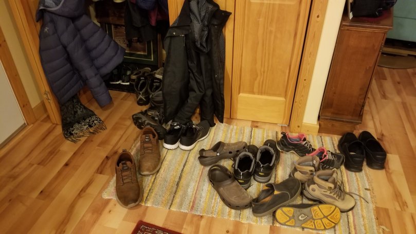 The other side is dear, but also a little stressfull as the number of people in the house swells, the kitchen counters are crowded with supplies, refrigerators are full of leftovers and entryways look like this.