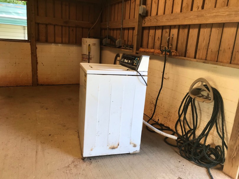 Yesterday, after taste testing the reception menu, I went out to work on the venue – the groom’s farm and barn. I love to dig into dirt and dust where I can really see I’ve made a difference. There was an area of the barn that met this description so I started dragging things out to be washed and de-spidered. Here’s where the washing machine enters the story.