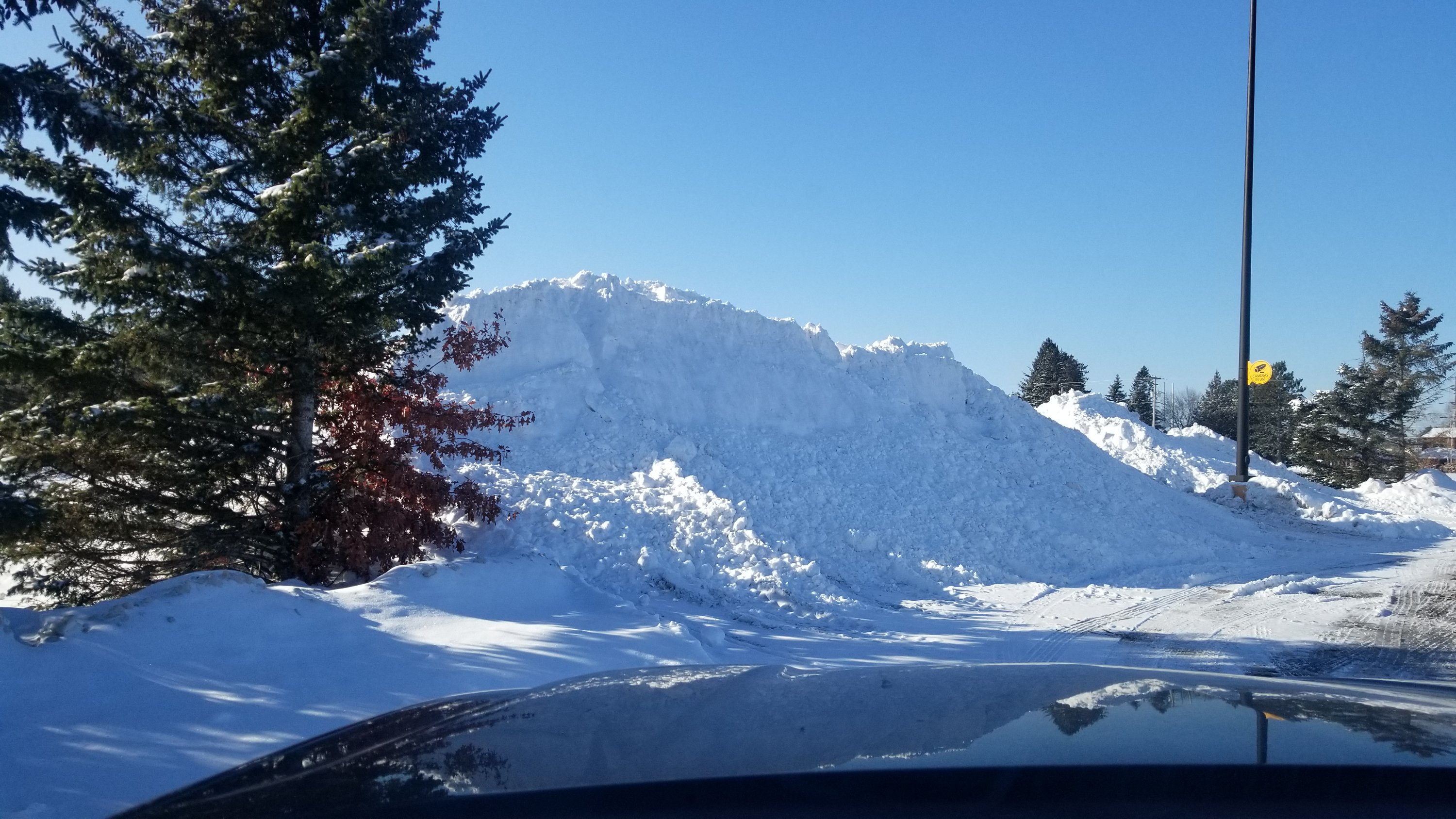 On the other side of our back fence, the Walmart Alps are forming. The parking lot is rimmed by white peaks, large enough to be dangerous should they tumble down on someone. I had to take pictures, amazed at how much they resemble real mountains with cliffs, abutments, scree and all.