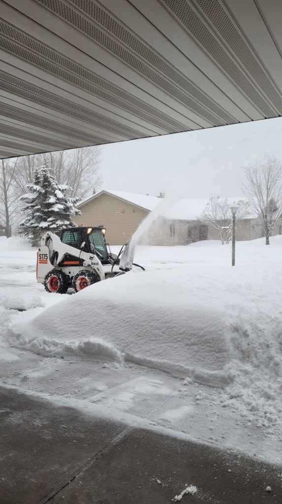 Every day when new snow has fallen I hear the plows starting to work, early before light. The major highways, two of them, near our house have to be kept as clear as possible. There are also quite a few big parking lots. It is early in the season and more snow can be expected, which means that room must be made for it. My brother plows our subdivision and he pushes the snow as far back on the lawns as his machine will allow. He makes the road as wide as possible.